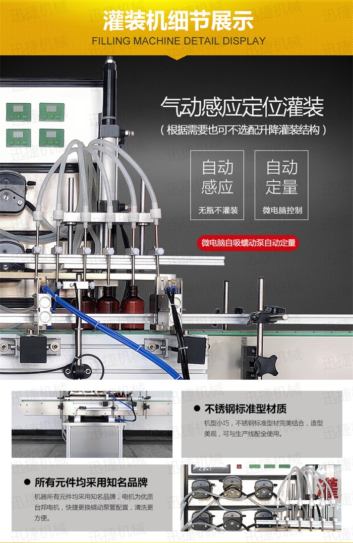 特 點(diǎn):定量灌裝,和瓶蓋旋蓋,在一臺(tái)機(jī)器上完成。具有占地空間小,自動(dòng)化程度高特點(diǎn)