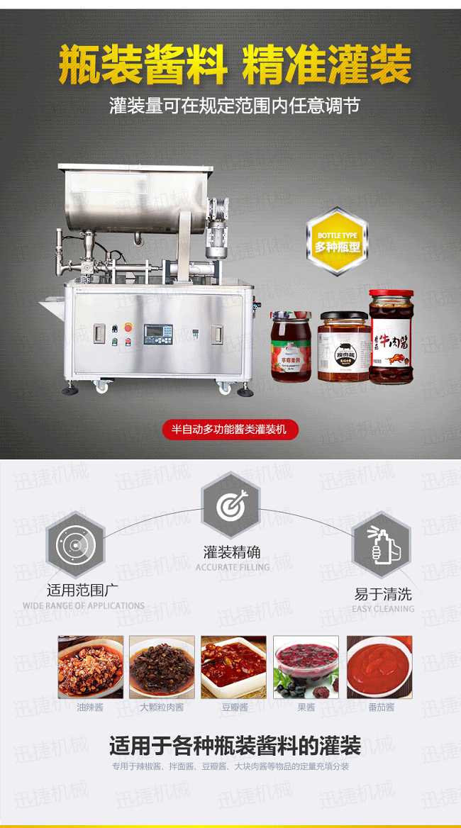 本瓶裝辣椒醬灌裝機專用于辣椒醬、拌面醬、豆瓣醬、大塊肉醬等物品的定量充填分裝,適合于將各類粘稠體及含有各種固體物質如辣椒、花生、肉塊、佐料等物體的醬類灌裝各種容器中,適用于各種瓶裝醬料的灌裝。