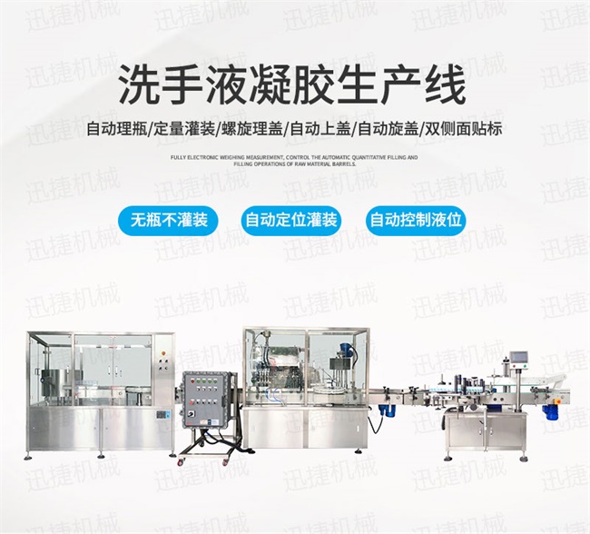 全自動凝膠生產線適用于消毒凝膠、免洗手洗手液、免洗手消毒凝膠、消毒液、84消毒液、醫(yī)用酒精、75%酒精消毒液、75度酒精、消毒水、殺菌消毒劑、醫(yī)用酒精、碘酒、次氯酸鈉、劑、醫(yī)用乙醇消毒液、瓶裝消毒劑等產品,有多頭全自動消毒液灌裝機和封箱機、貼標機、打包機、噴碼機等配套設備組成,實現(xiàn)消毒液自動灌裝,自動旋蓋,自動貼標,從灌裝、到成品的全部過程