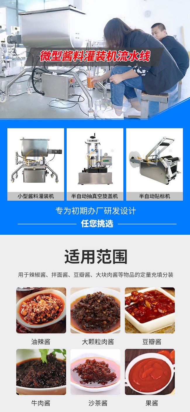 我公司新研發(fā)小型醬料灌裝生產線,包含三款小設備,小型醬料灌裝機、半自動抽真空旋蓋機、半自動貼標機、該小型醬料生產線專為初期辦廠研發(fā)設計,適用于辣椒醬、拌面醬、豆瓣醬、大塊醬等醬料的定量灌裝,該產品支持定制,選用306不銹鋼材質,灌裝精度高,防止滴漏,選用plc觸屏智能控制,防滴漏防拉絲,突破傳統(tǒng)的灌裝方式,可根據(jù)瓶子高度調整灌裝頭高度,采用防滴漏設計,灌裝時不滴不漏。