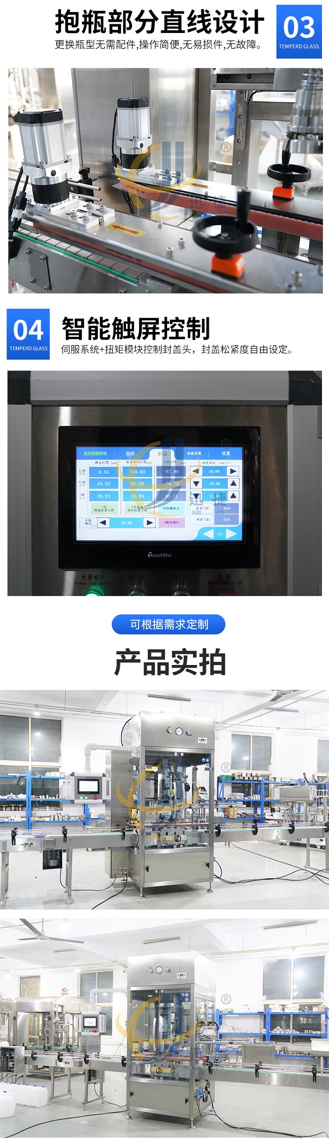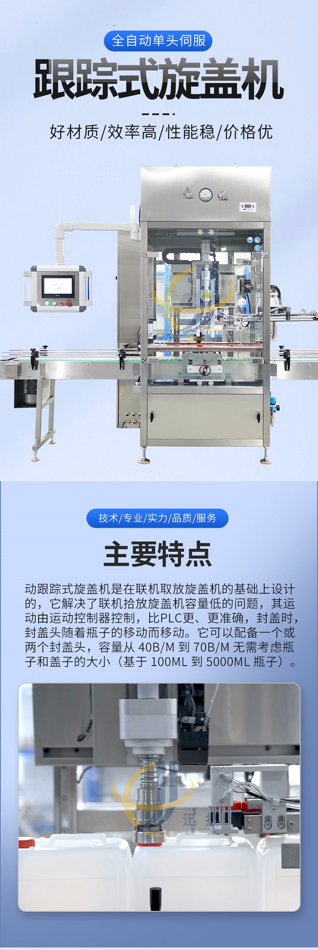 跟蹤式旋蓋機(jī)是在聯(lián)機(jī)取放旋蓋機(jī)的基礎(chǔ)上設(shè)計(jì)的,它解決了聯(lián)機(jī)拾放旋蓋機(jī)容量低的問(wèn)題,其運(yùn)動(dòng)由運(yùn)動(dòng)控制器控制,比PLC更、更準(zhǔn)確,封蓋時(shí),封蓋頭隨著瓶子的移動(dòng)而移動(dòng)。它可以配備一個(gè)或兩個(gè)封蓋頭,容量從 40B/M 到70B/M 無(wú)需考慮瓶子和蓋子的大小(基于 100ML到5000ML瓶子)。
