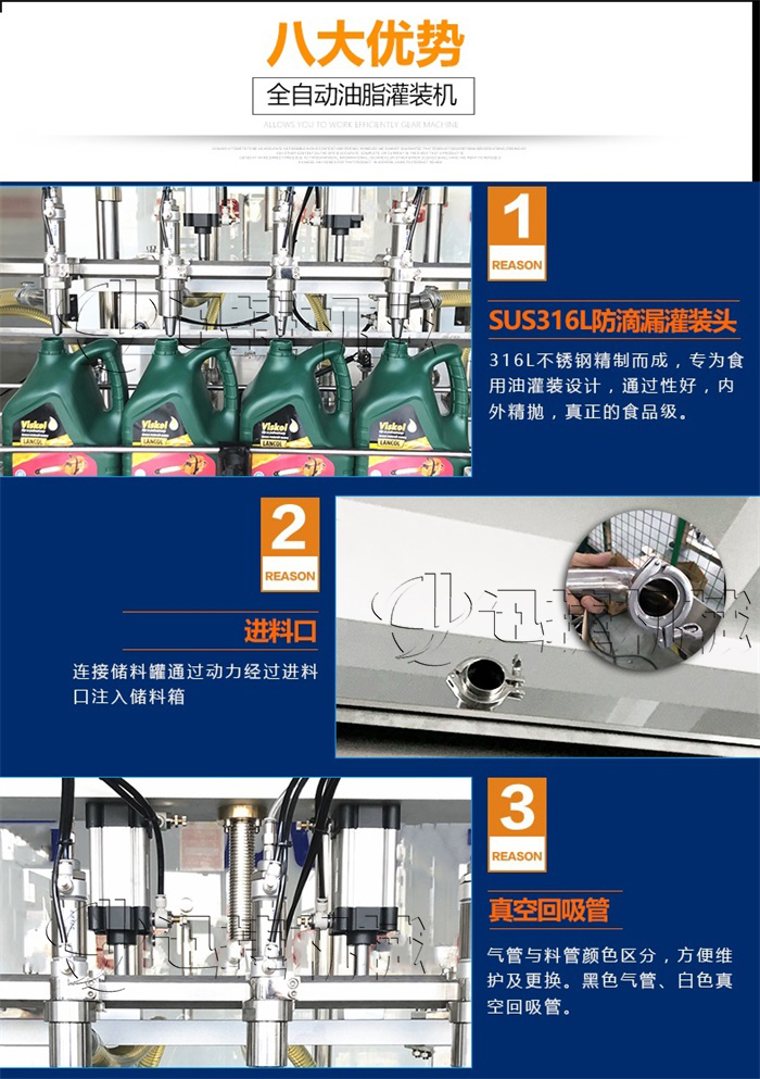 本機(jī)是根據(jù)潤(rùn)滑油的特性而設(shè)計(jì)的一款全自動(dòng)稱重式潤(rùn)滑油灌裝機(jī),該機(jī)設(shè)計(jì)緊湊合理,外形簡(jiǎn)介美觀大氣,灌裝量調(diào)節(jié)方便,精度高。借鑒了歐美國(guó)家的灌裝流程控制技術(shù),彩色觸摸屏人機(jī)界面,灌裝進(jìn)程實(shí)現(xiàn)一鍵操作,性能穩(wěn)定。采用兩個(gè)316儲(chǔ)油罐解決灌裝量大的問(wèn)題,一個(gè)進(jìn)油口控制兩個(gè)油箱的液位,一個(gè)儲(chǔ)油箱分別控制5個(gè)灌裝頭,速度更快,精度更高。